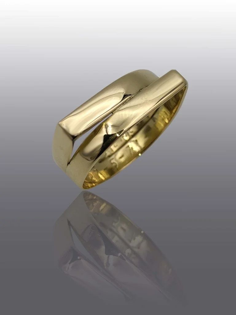 Deze trouwring is een mooie strakke overliggende ring geworden. De ring is aan weerszijden gesplitst en verbreed, daarna afgedekt met een gouden plaat en ter versieren een roodgouden baan erop.
